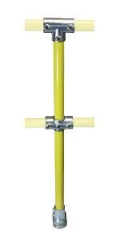 Interclamp fitting 403 is a yellow mid-post of a handrail section for flat surfaces. The post is supplied with Interclamp fitting 104, which allows the top rail to be joined within the fitting or pass through as required. Please note that the middle rail cannot pass through the upright.